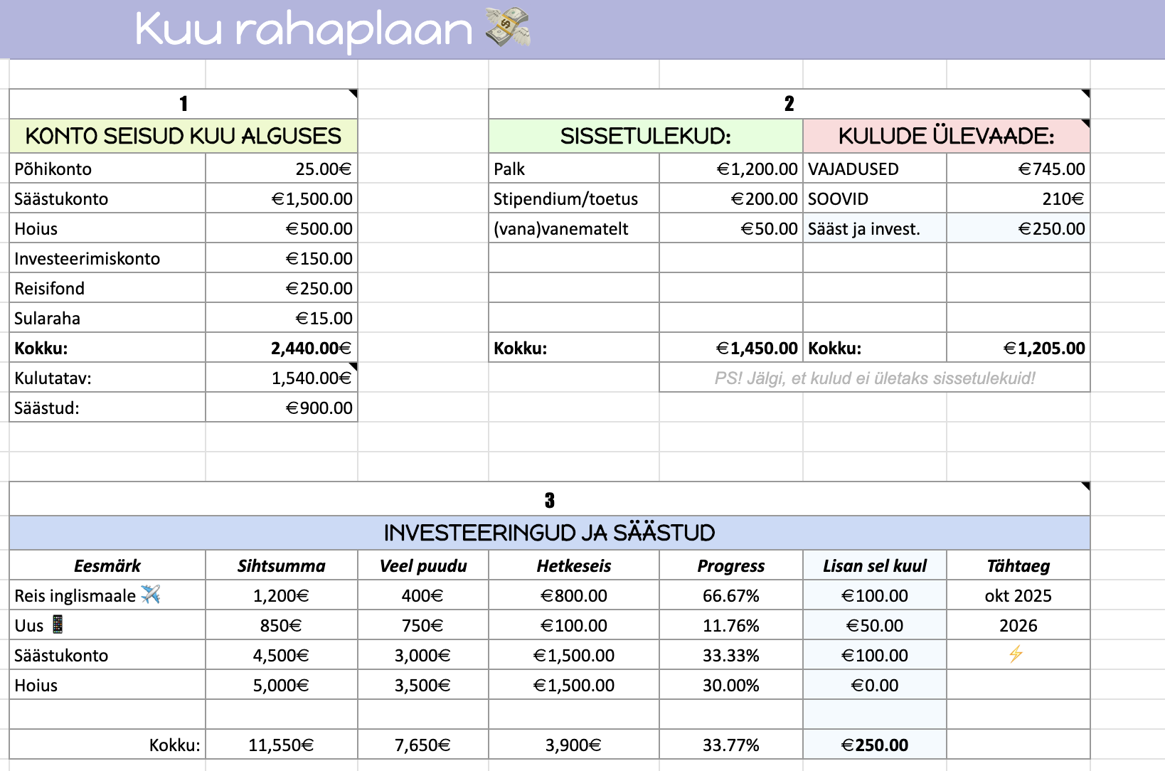 Oleme loonud lihtsasti kasutatava, kuid sisuka raha juhtimise tööriista, mis on mõeldud just noortele, kes oma iseseisvat elu alustavad või kellel veel pole toimivat rahasüsteemi välja kujunenud.