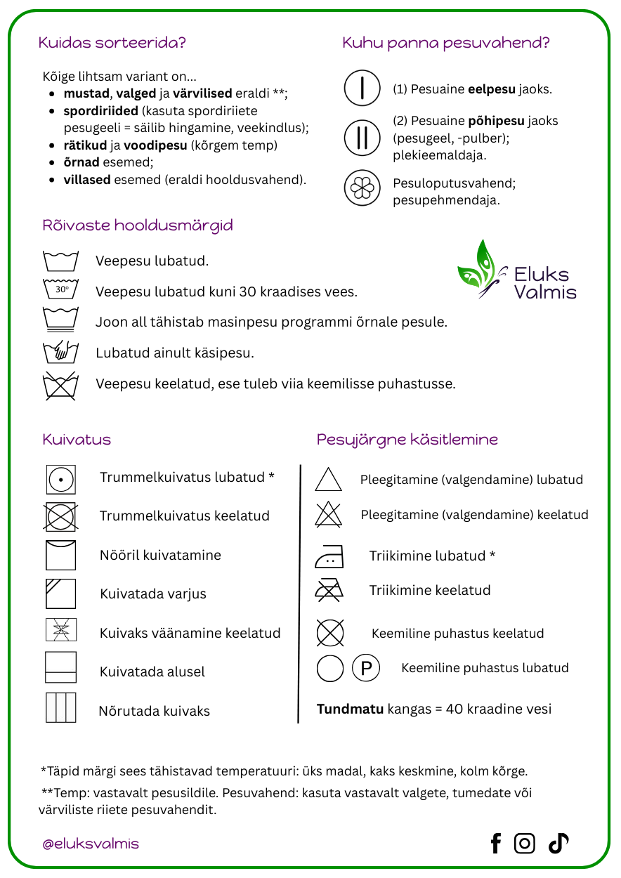 Oleme sulle loonud pesu pesemise spikri, mille saad pesumasina kohale välja printida või telefoni alla laadida.